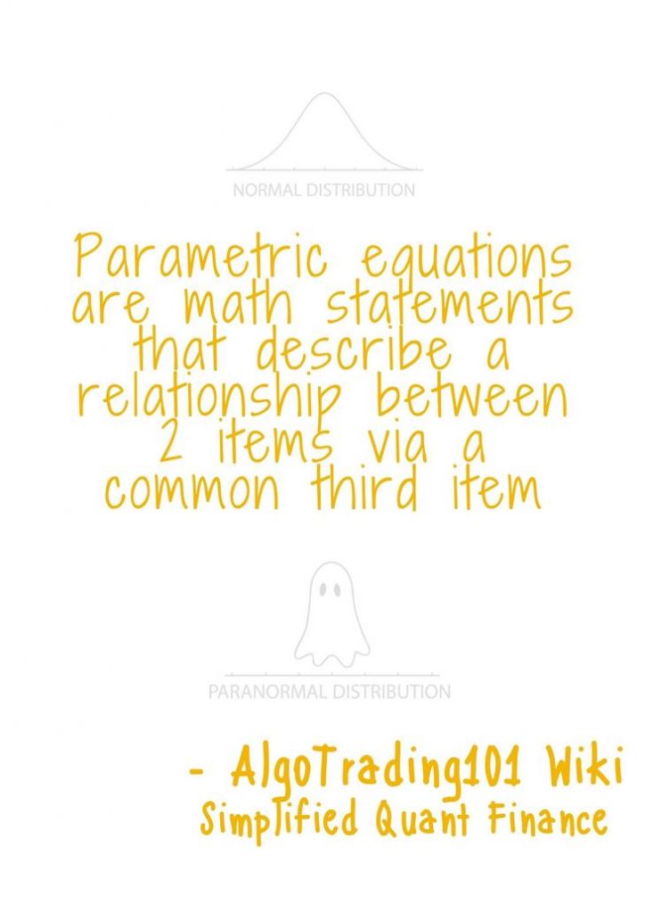 Parametric equations are math statements that describe a relationship between 2 items via a common third item.